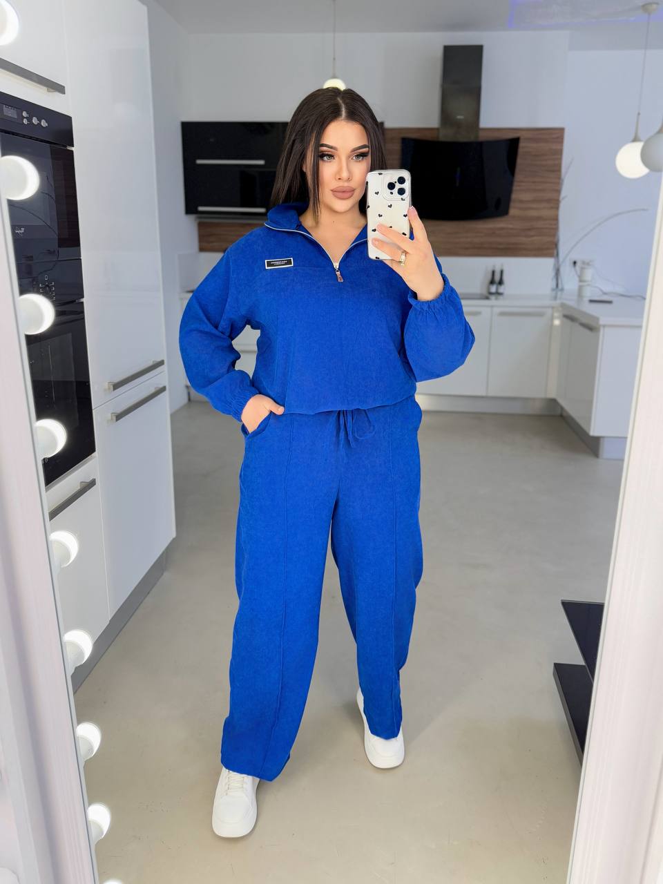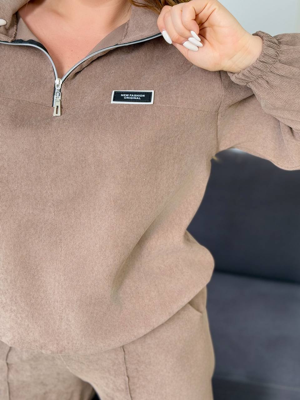 Кофтина зі спущеними рукавами, низ регулюється куліскою. Штани універсальні, рівного крою з відстроченими стрілами, мають дві кишені, еластичний пояс теж регулюється куліскою. Гарна посадка.