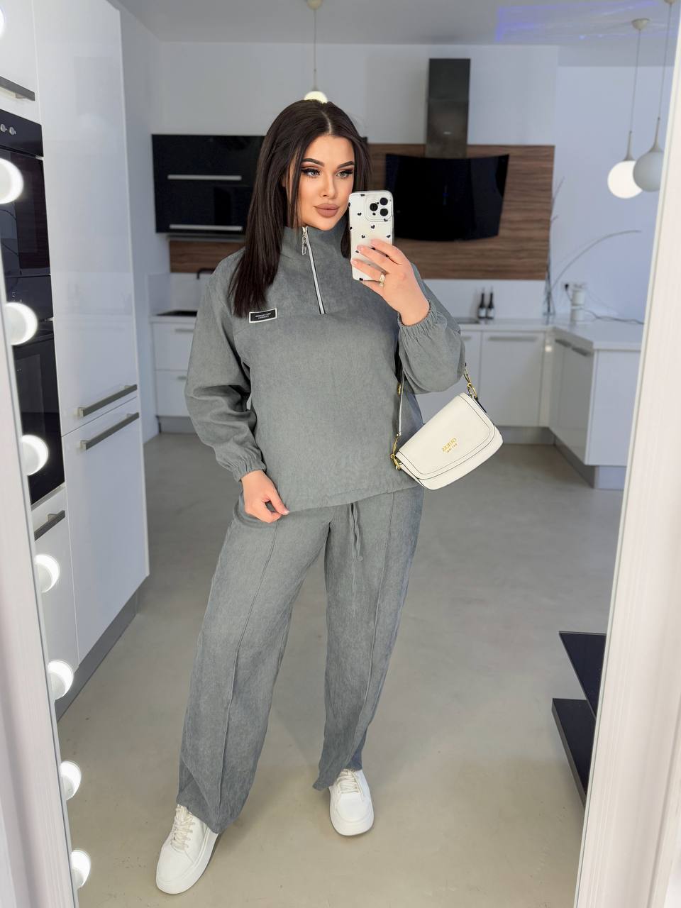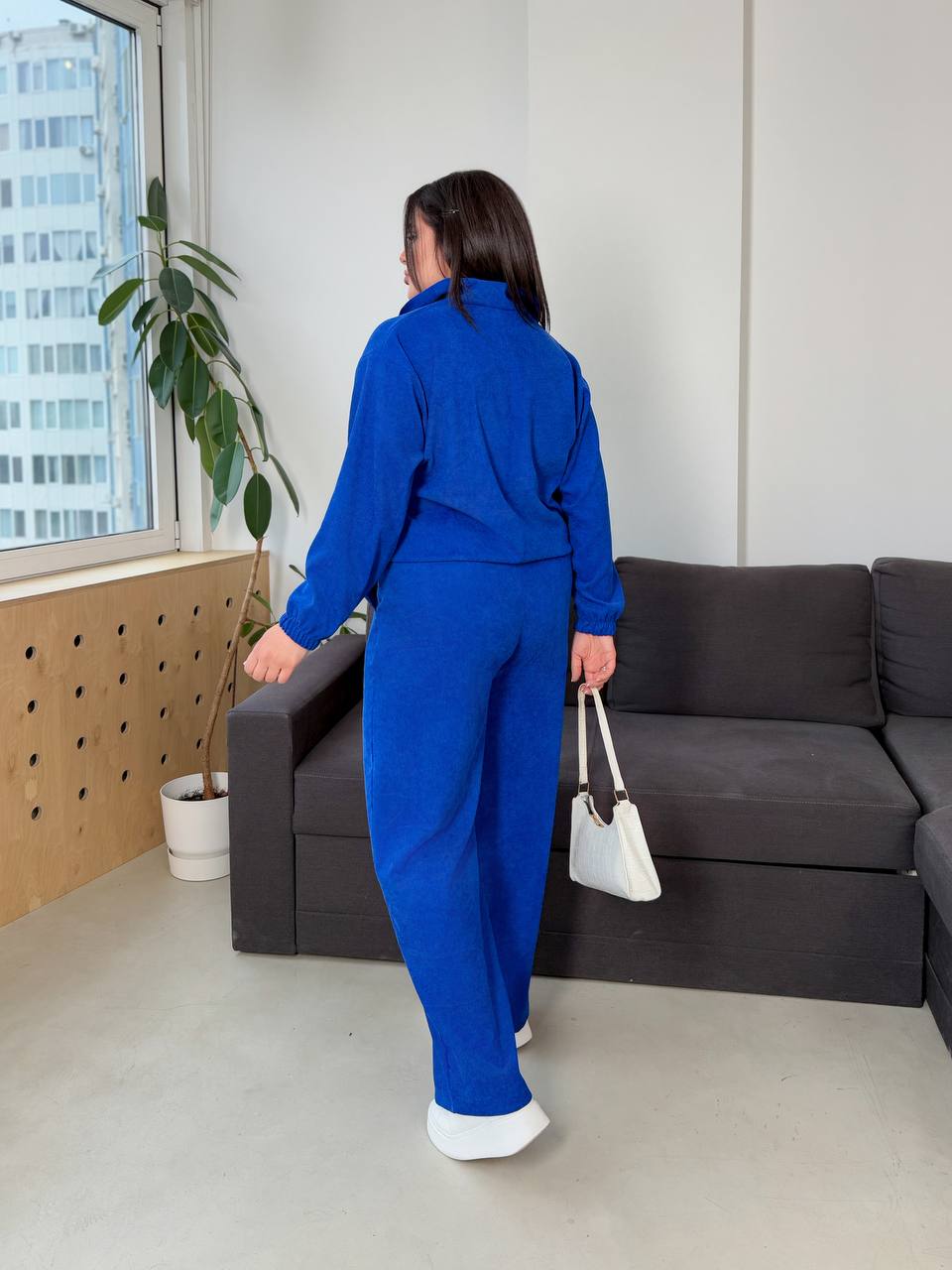 Кофтина зі спущеними рукавами, низ регулюється куліскою. Штани універсальні, рівного крою з відстроченими стрілами, мають дві кишені, еластичний пояс теж регулюється куліскою. Гарна посадка.